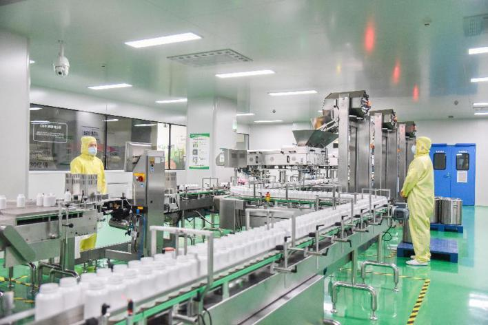 据了解,园区的照明、制冷,生产用电、用水等优先依靠自建的2.3兆瓦屋顶光伏电站。每年园区自发电量为315万度,可减少煤炭消耗2003吨,相当于减少二氧化碳排放5248吨。2024年,园区的二氧化碳排放强度为0.03吨二氧化碳当量/万元,远低于全球平均水平。 在降低能耗上下狠功夫的同时,园区在推动资源循环利用上频出实招,一方面委托具备资质的物资回收公司将生产过程原辅料包装材料全部回收,使工业固体废物综合利用率达到100%,另一方面将生产过程中产生的废水收集到厂区污水站深度处理后,用于灌溉园区的花草树木,让资源在循环利用中发挥最大效益。 当前,园区已经全面通过ISO9001、ISO14001、ISO22000、ISO45001、ISO50001国际体系认证,在食品安全、产品质量、环境保护等领域均达到国内领先水平。 GMP车间里藏着“绿色密码” 洗手、消毒、换衣、除尘……每一位进入园区生产车间的人员都要经过这一系列繁琐的程序。反光的地面、不着一丝污迹的角落、自动化运转的精密仪器、灯火通明的车间,这里看上去更像是一间偌大的、枕戈待旦的手术室。