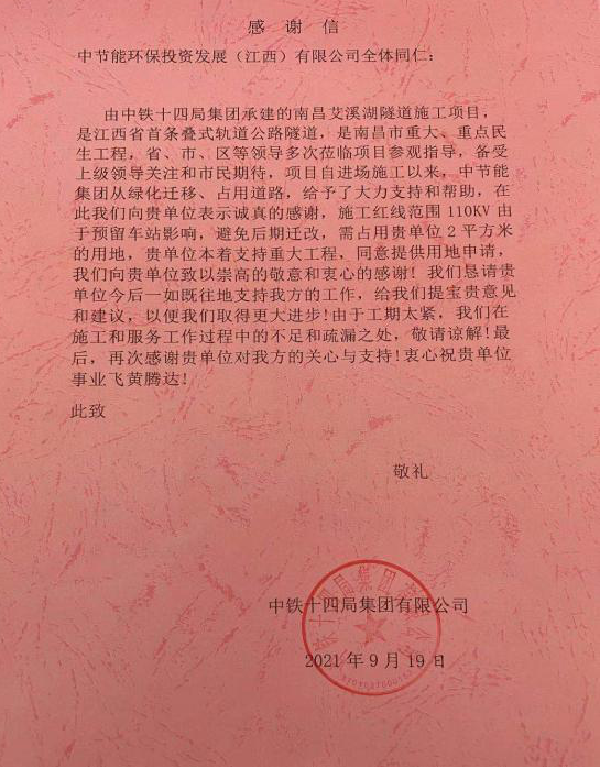 南昌市艾溪湖隧道项目为南昌市重大重点工程,项目正处于紧张的施工阶段,由于项目工期紧任务重,2022年春节前必须通车,中铁十四局集团有限公司根据现场情况对规划进行临时调整,需占用中节能国际中心项目部分红线内用地。江西公司为支持南昌市轨道交通事业发展,也为了践行央企社会责任,第一时间增加总经理办公会议题,并审议通过了占地申请,以实际行动支持该重大重点民生工程建设。 锦旗是荣誉,更是责任。江西公司将继续秉承国有企业的初心和使命,勇担央企社会责任,为助推地方政府绿色发展,打造美丽中国“江西样板”贡献央企力量。